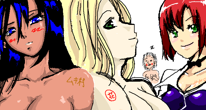 左からムキ村さん、花○さん、サヤマさん、後ろの物体が管理人作です。