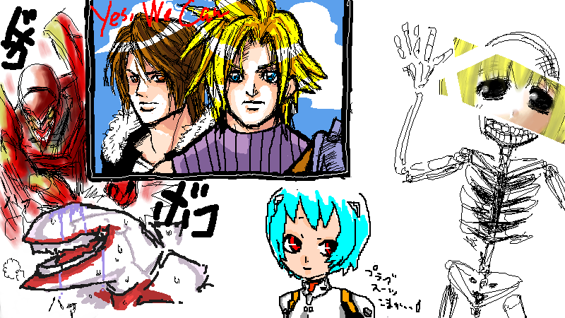 弐号機とガイコツが花○さん、量産機が管理人、イケメンズがサヤマさん、レイがサイヅカさん作です。